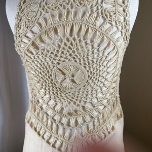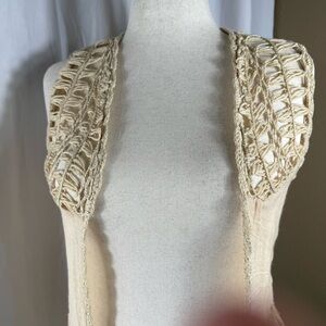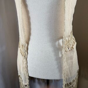 Lightweight sleeveless vest with open front. Crochet trim on shoulders and back detail. Fringe hem for a boho look. Soft cream color.