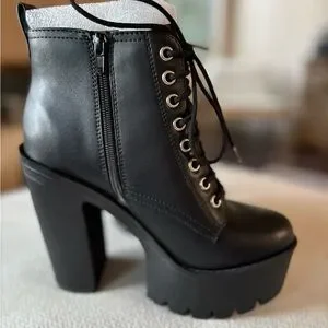 Elevate your wardrobe with these elegant black lace-up platform boots. Perfect for adding a touch of sophistication to any outfit.