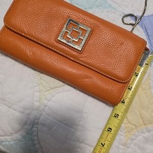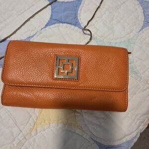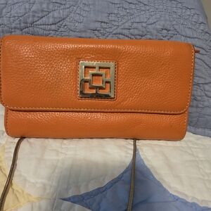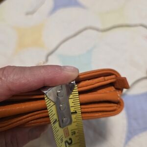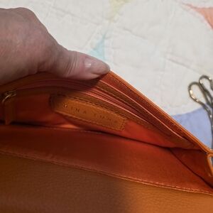 Stylish orange leather clutch with a chic design and sleek gold accents. Perfect for any occasion!