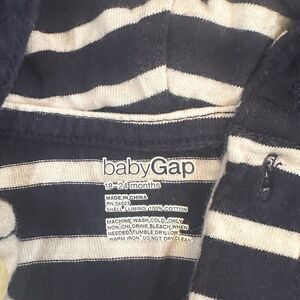 Super adorable Baby Gap set of two long sleeve long pants boys rompers. The navy blue and white striped romper has a hoodie with snap closures on the bottom on of the pants for easy wear and is a size 18-24 months.