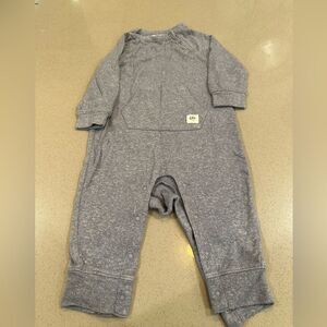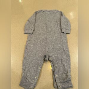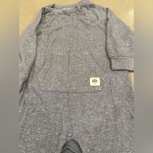The second romper is a light blueish/grey color color long pants and long sleeve. Has a cute pocket in the front and is a very soft and cozy material. Also has snap buttons on the bottom for easy wear and is a size 6-12 months.