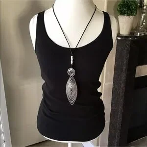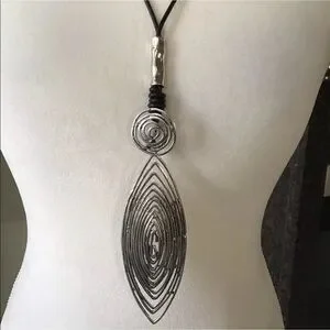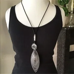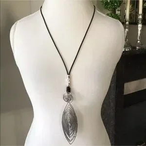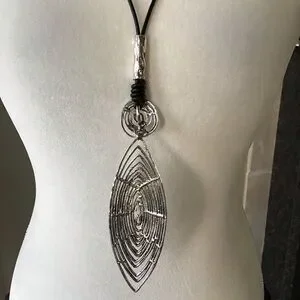 Tribal Look Pendant Statement Necklace - Silver Tone Wire 30” Black Waxed Cord NEW