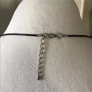 Silver Tone alloy metal, approx. 30” black waxed cord, 15” cord drop when fastened, lobster clasp, 2” chain extender.