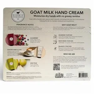 Dionis Goat Milk Hand Cream is a nourishing, non-greasy moisturizer formulated to hydrate dry hands and leave skin soft and smooth. Made with goat milk, it helps support the skin’s natural moisture balance and is gentle enough for everyday use.
