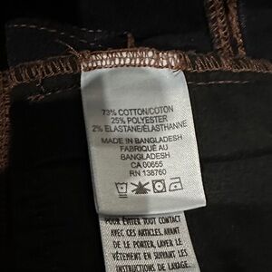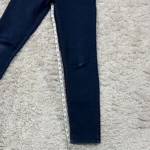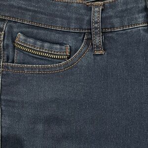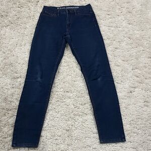 Soft high-rise stretch denim. Super comfy. Dark blue wash with contrast stitching. Classic five-pocket style with zip detail. Sleek, versatile everyday jeans. EUC