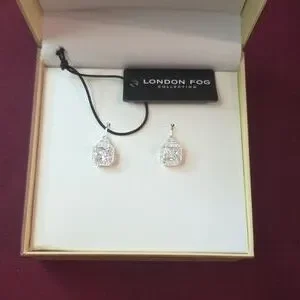 Sparkling clear crystal drops with halo accents. Silver-tone metal setting. Comes with London Fog tag. Dressy and refined look.