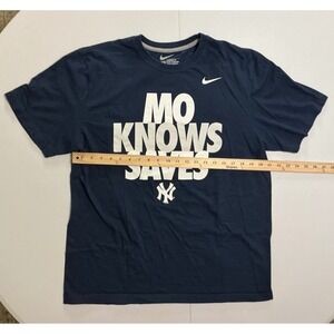 Nike Mariano Rivera New York Yankees tribute tee celebrates the legendary closer with a bold "Mo Knows Saves" graphic on the front and his record-breaking 602 all-time saves on the back. No rips, tears or stains.