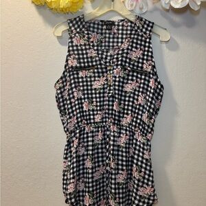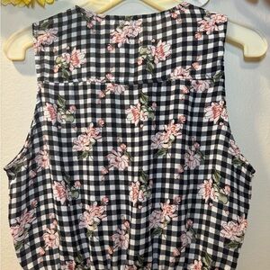 Sleeveless tank top with black and white gingham and pink floral accents. V-neck with decorative front zipper details. Elastic waist for a defined silhouette. Lightweight and easy to pair with casual looks.