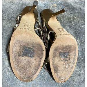 Pre-owned in good condition with wear on bottom and heel has scratches. Footbed show some wear…overall when this heel is on it’s great!