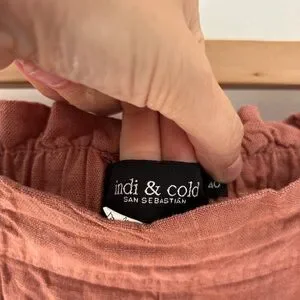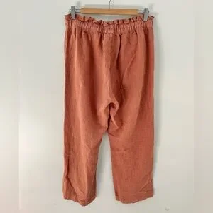 Relaxed wide-leg pants in a warm terra cotta color. Soft linen-blend fabric with an elasticized ruffled waistband for comfortable all-day wear. Front patch pockets add casual utility. Versatile style that pairs easily with tees or blouses.