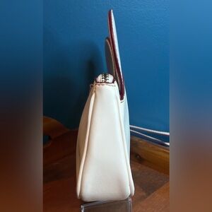 Made with very soft, smooth glovetanned chalk white leather with red edging and gunmetal hardware, this sweet Mickey Mouse wristlet measures approximately 7 1/2” wide, 4 1/2” high (7 1/4” with ears) 2” deep, with a detachable wristlet strap drop of 7 1/4”.