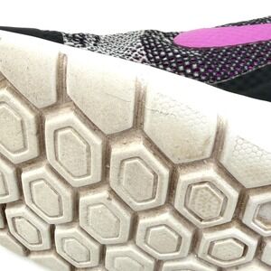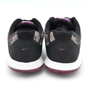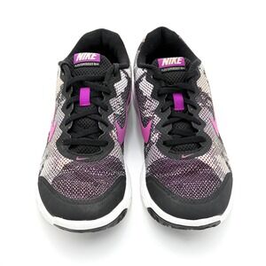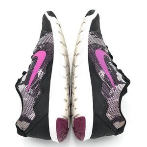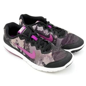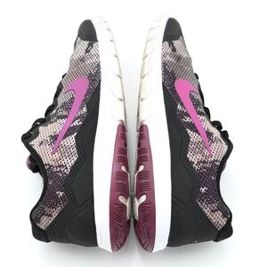 Nike Flex Experience RN 4 running shoes combine a lightweight, breathable mesh upper with a flexible foam midsole for a natural range of motion. These athletic sneakers feature a distinctive purple and black patterned knit design accented by vibrant pink Swoosh logos and tongue branding. The low-top silhouette is finished with a durable rubber outsole and a secure lace-up closure, making them ideal for gym sessions, light runs, or casual everyday wear.