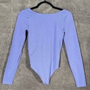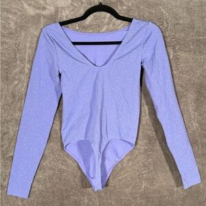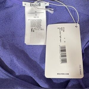 NWT Wolford bodysuit in Ultra Violet / Light Aqua (tag shown). Size M. Shimmer stretch knit with long sleeves and pull-on bodysuit design (no gusset snaps).