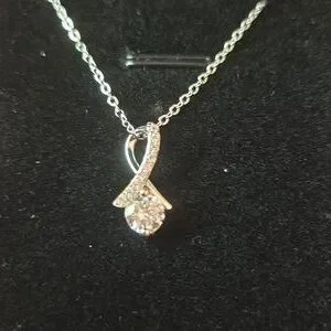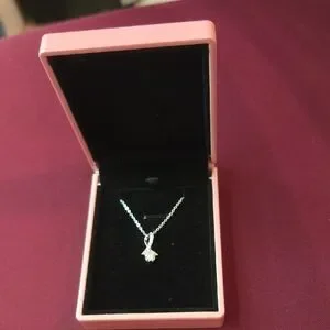 Delicate sterling silver drop pendant necklace with a sparkling cubic zirconia stone. Presented in a pink jewelry box for gifting or storage. Elegant pink-accented packaging complements the silver necklace. Perfect everyday or special occasion accessory.