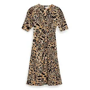 Make the day wild in this leopard-print dress that's slit up the thigh and puckered down the hip with pleats. More pleats at the shoulders and short sleeves lend interesting drape to this sassy look.