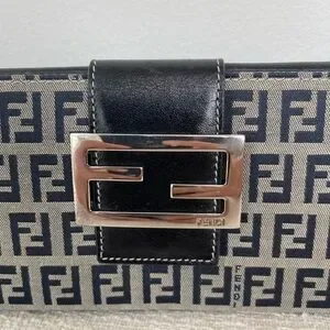 Chic Fendi clutch with iconic monogram pattern. Features a sleek black buckle. Ideal for stylish outings.