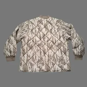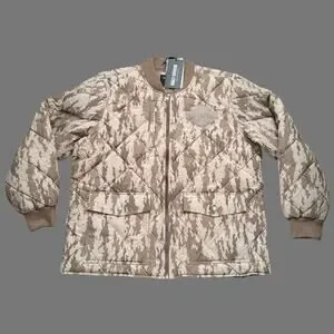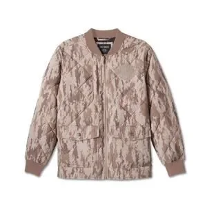 Featuring a rugged brown camouflage colorway, this jacket is crafted from a soft, peached nylon and cotton plain weave that is poly-filled for reliable warmth. Its quilted, workwear-inspired silhouette offers a relaxed fit, making it a perfect blend of comfort and durability for the cooler months.