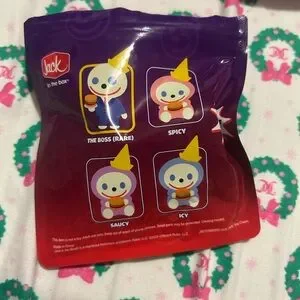 Limited edition Jibbi bag charm from Jack in the Box. Soft rubber charm with keyring. Features white face, blue eyes, red smile, yellow party hat, navy suit, and a colorful mini burger. Bright and playful accessory. Great for bags or keys.