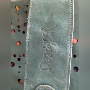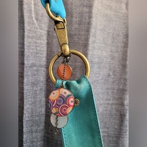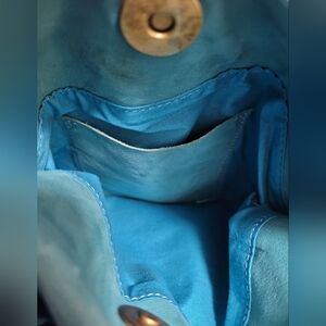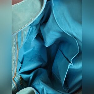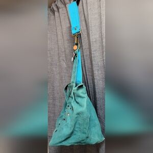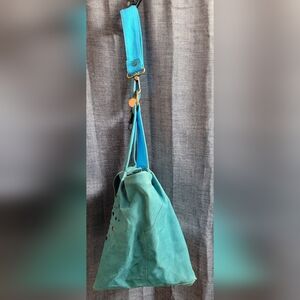 Desigual leather tote in teal. Perforated exterior reveals colorful lining. Subtle embossed logo on strap. Casual, modern style.