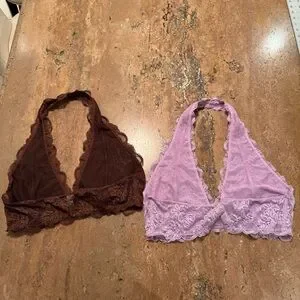 Excellent Like New Condition. Set of 2 Brown and Purple Free People Intimately brand is their softest intimates and best-ever base layers. Intimately is an in-house label from Free People. Forever timeless and so femme, this lacey bralette is featured in a halter style with scallop trim and a deep V-neckline. Fit is Pull on style, halter silhouette, not adjustable.