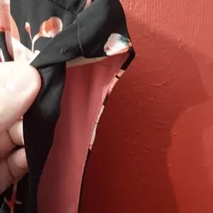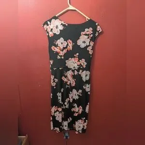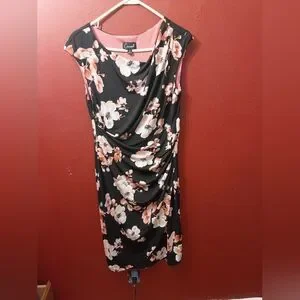 Chic midi dress with a black base and pink floral design. Draped neckline adds elegance. Ideal for versatile styling.