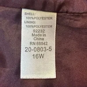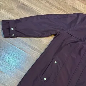 This coat is long. It zips up the front and has buttons at the front and on the wrist to adjust. Has a hood and pockets. Made with polyester. Machine washable. Very clean. Pre-owned-excellent condition.