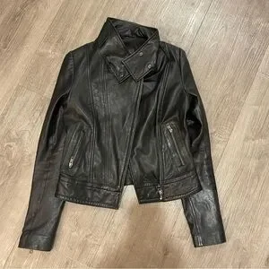 Chic and edgy leather jacket. Features asymmetrical zipper and sleek design. Perfect for versatile styling.