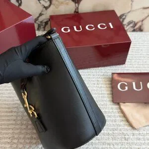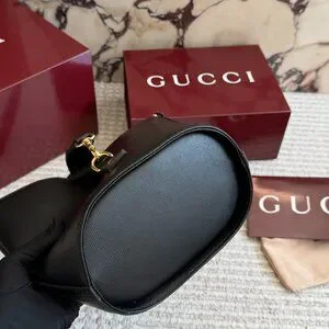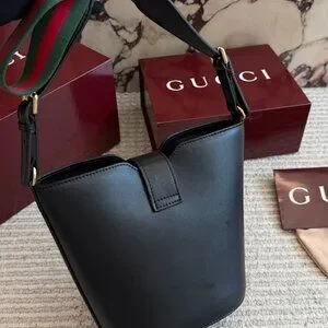 Gucci Black Leather Mini Bucket Bag Web Stripe Shoulder Strap + Box
