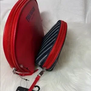 Bold red with black stripes. True Religion branding. Ideal for travel essentials.