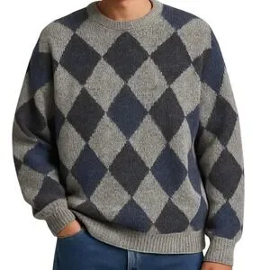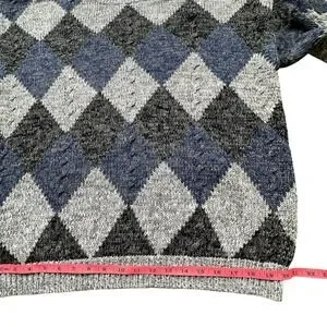 Featuring a bold oversized argyle pattern in blue, gray, and black, this pullover sweater blends preppy vintage vibes with modern streetwear edge. Crafted in a thick, soft knit with a slightly relaxed fit, this chunky warm cozy sweater is knitted by hand frame and perfect for both casual layering and elevated cold-weather looks.