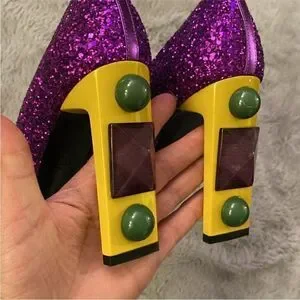 Dazzling purple glitter heels with bold yellow accents. Perfect for a chic statement look. No box