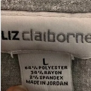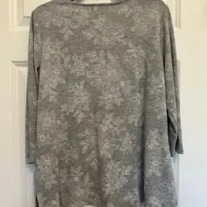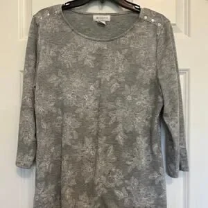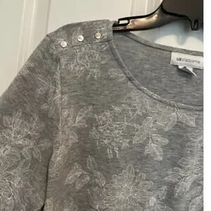 Soft knit Liz Claiborne top featuring a subtle gray floral print and decorative button detail on the shoulders. Comfortable stretch fabric makes it perfect for everyday wear or office casual outfits.