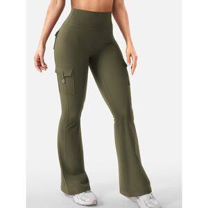 Women's Army Green High Waisted Workout Flare Leggings 32 inch Seam with Pockets