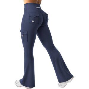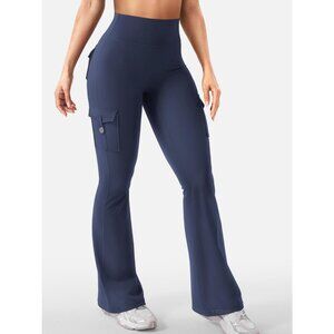 Women's Navy High Waisted Workout Flare Leggings 32 inch Seam with Pockets