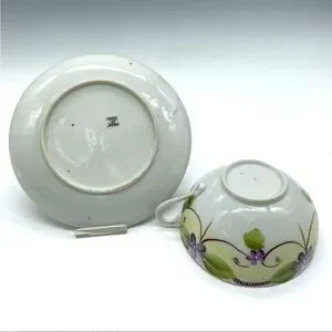Great for tea or charcuter-tea! Delicate design over white porcelain of purple flowers with green leaves. Gilt accents on border and rim of cup. Cup measures 2"H × 4" dia. and saucer 1"H x 5.5" dia. Made in Japan backstamp.