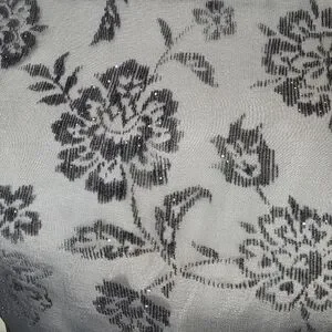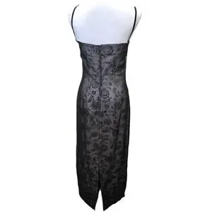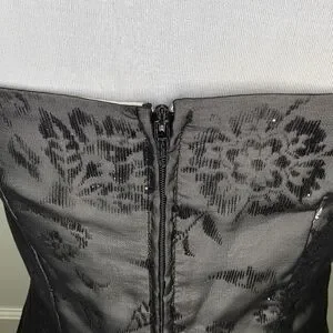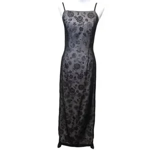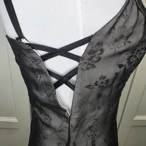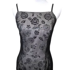 Stunning black floral dress has a sheer black floral overlay over white with a sleek silhouette. Long slit in the back. Spaghetti straps. A little glitter but not overpowering.