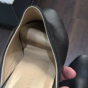 Fair condition. The leather and heels are in good condition, but the front of the insoles are detached. They slip back into position very easily.