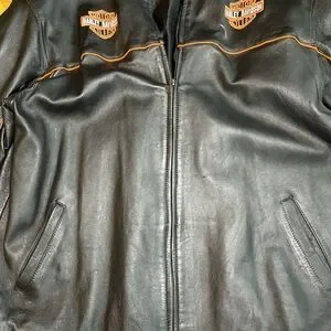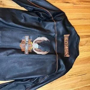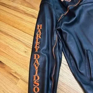 Sleek black jacket featuring orange piping. Harley-Davidson logos on chest and sleeve. Perfect for motorcycle enthusiasts.
