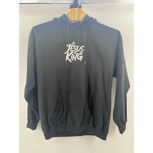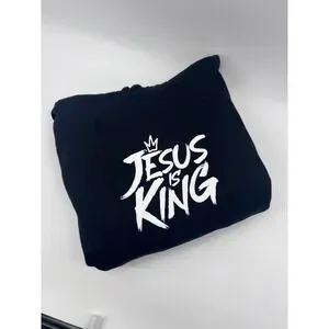 Gods Love Overcomes Jesus is King black hoodie sweatshirt. This pullover features a comfortable hooded neckline with adjustable drawstrings and a spacious front kangaroo pocket. The bold white graphic "Jesus is King" with a crown adorns the chest.