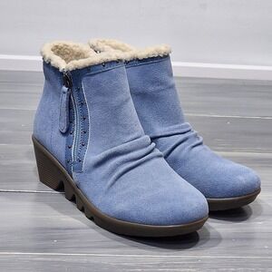 Cozy blue suede ankle boots with a plush faux fur lining and a comfortable wedge heel. These stylish boots feature a side zipper closure with decorative stud detailing and a ruched effect on the shaft for added texture. The Air-Cooled Memory Foam insole provides exceptional cushioning for all-day wear. Perfect for casual outings, running errands, or enjoying a chilly day outdoors.