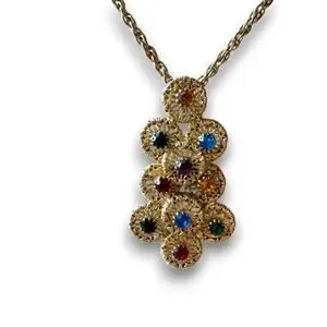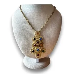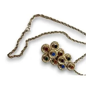 Based on the construction and the use of textured goldtone filigree, this piece likely dates to the late 1960s or early 1970s. This era was known for costume jewelry that favored architectural, tiered designs and "Sputnik" or brutalist-inspired textures. The multi-color palette is reminiscent of Dezza or Sarah Coventry styles from that period, which aimed to provide high-impact visual appeal for both day and evening wear.