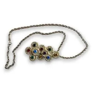Vintage Multi Color Rhinestone Filigree Statement Pendant Necklace 23 Inch Chain