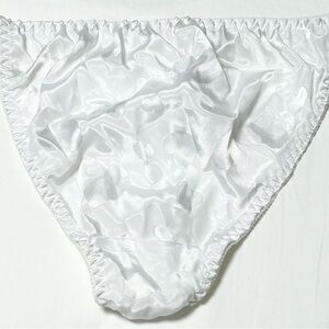 The product is a set of three vintage hi-cut satin lace panties in size medium from Victoria's Secret, Van Dale and Bravissima. These glam rock-inspired panties come in a variety of colors and are made from nylon material, providing a luxurious and comfortable feel. Perfect for adding a touch of vintage charm to any lingerie collection, these panties are sure to make a statement with their bold design and high-quality.
