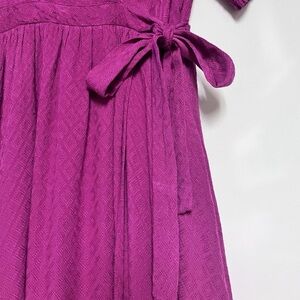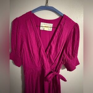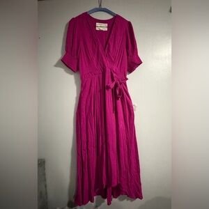 Chic fuchsia midi dress with wrap design. Features short sleeves and a flowing skirt. Perfect for any occasion.