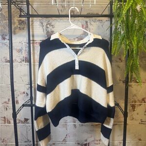 Chic navy and cream sweater with bold stripes. Perfect for casual wear.
