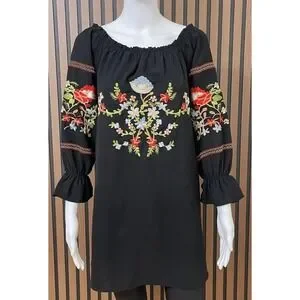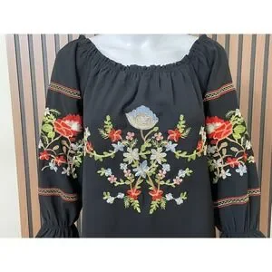 The Free People Fleur du Jour Women's S Black Dress is a stylish and versatile piece perfect for summer, fall, and spring. This mini dress features off the shoulder neckline, long balloon sleeves, and intricate floral embroidery for a bohemian and peasant-inspired look. Made from lightweight and stretchy polyester material, this dress is comfortable for various occasions such as parties or casual outings. With its elegant design and brand quality of Free People, this dress is a must-have for any fashion-forward woman looking to add a touch of flower-inspired charm to her wardrobe.