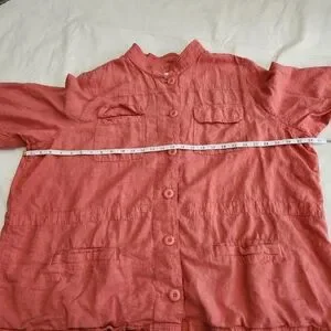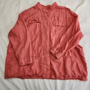 Stylish coral utility jacket with button-up front. Features multiple pockets. Ideal for casual wear.