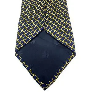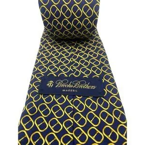 The Brooks Brothers Makers 100% Silk Necktie in Navy Blue with gold equestrian horse bits is a luxurious and stylish accessory perfect for the modern gentleman. Made from high-quality silk, this long tie features a classic geometric pattern with a touch of equestrian flair. The adjustable design and classic width make it versatile and suitable for a variety of occasions, while the handmade craftsmanship ensures a unique and premium piece. Representing the timeless style and quality associated with Brooks Brothers, this designer tie is sure to elevate any outfit with a touch of sophistication.