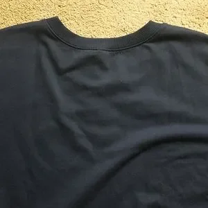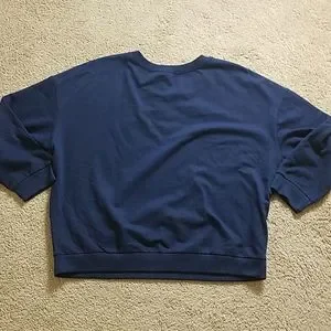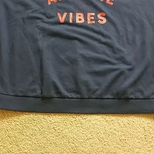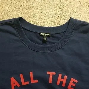 Express navy blue crew neck graphic sweatshirt. This adorable long sleeve navy blue with red graphic sweatshirt has all the Vibes graphic in red on front. Banded at sleeves and bottom. Size large measures 28 armpit to armpit and 26. Perfect sweatshirt to wear during the summer on cooler nights or pair with jeans during the winter for a polished look. New with tags.
