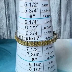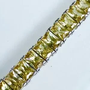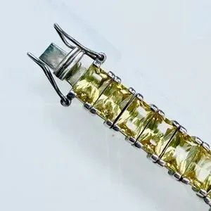 Beautiful silver-toned tennis bracelet featuring vibrant yellow square-cut gemstones.